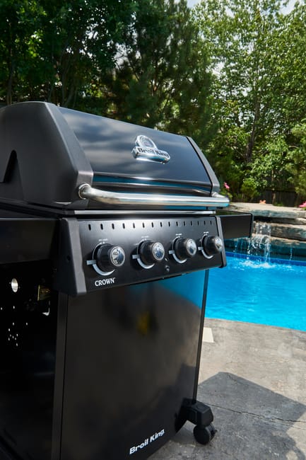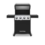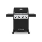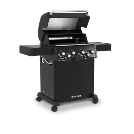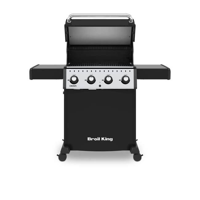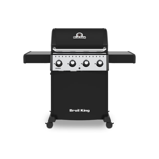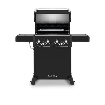 Barbacoa de gas Broil King Crown 410, fabricada en acero de color negro. Cuenta con 4 quemadores de acero inoxidable y una potencia de 11,4 kW. Encendido electrónico. Parrillas de hierro fundido reversibles de alta resistencia, rejilla de calentamiento con recubrimiento porcelánico y difusores de acero inoxidable. Mesas laterales abatibles. Cabina cerrada con paneles frontal y laterales. La bombona de gas grande cabe en el interior quedando completamente oculta. Bandeja recolectora de grasa extraíble. Ruedas fijas y orientables para mayor comodidad de transporte. Este modelo se puede complementar con placa para pizza, plancha, wok o con una funda para que la protejas mientras no la estés usando. Incluye 10 años de garantía en cuba y tapa y 5 años en los quemadores. Medidas: 145 x 116 x 61 cm (ancho x alto x fondo).