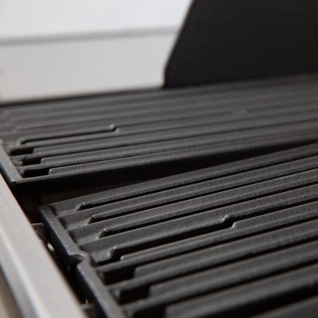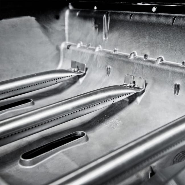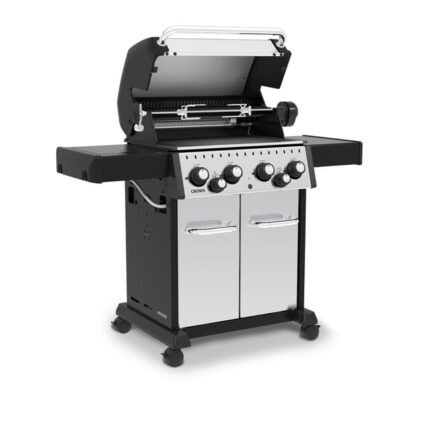 Barbacoa de gas Broil King Crown 480 fabricada en acero de color negro. Este modelo cuenta con 4 quemadores principales de acero inoxidable de 11,4 kW, 1 quemador lateral de 2,7 kW y 1 quemador trasero de 4,4 kW con kit rustidor premium. Encendido electrónico. Parrillas de hierro fundido reversibles de alta resistencia, rejilla de calentamiento con recubrimiento porcelánico y difusores de acero inoxidable. Mesas laterales abatibles. Cabina cerrada con paneles frontal y laterales. La bombona de gas grande cabe en el interior quedando completamente oculta. Bandeja recolectora de grasa extraíble. Ruedas fijas y orientables para mayor comodidad de transporte. 10 años de garantía en cuba y tapa, y 5 años en los quemadores. Medidas: 64 x 116 x 61 cm (ancho x alto x fondo).