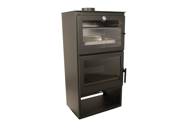 Estufa de leña con horno y bandeja en acero inoxidable en la parte superior, de 7,1 kW de potencia, fabricada en acero y acabado en color gris antracita. Cubre una superficie de calefacción de hasta 100 m², con un rendimiento del 81,1%. Clase energética llama verde de 7 estrellas. Salida de humos superior y carga de troncos frontal. Este producto no contiene sustancias peligrosas para las personas o el medio ambiente. Medidas: 56,3 x 113 x 43 cm (ancho x alto x fondo).