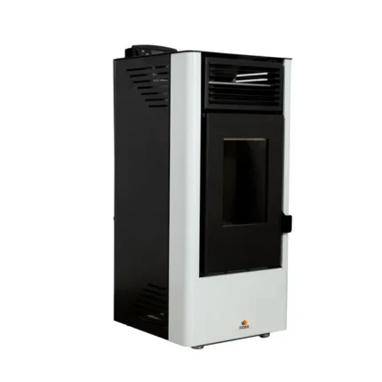 Estufa de pellets Eider Biomasa fabricada en acero de color blanco con brasero de fundición de 10,5 kW de potencia