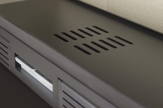 Cheminée à bois horizontale de 8,9 kW, en acier avec intérieur en vermiculite. Surface de chauffe jusqu’à 100 m², avec