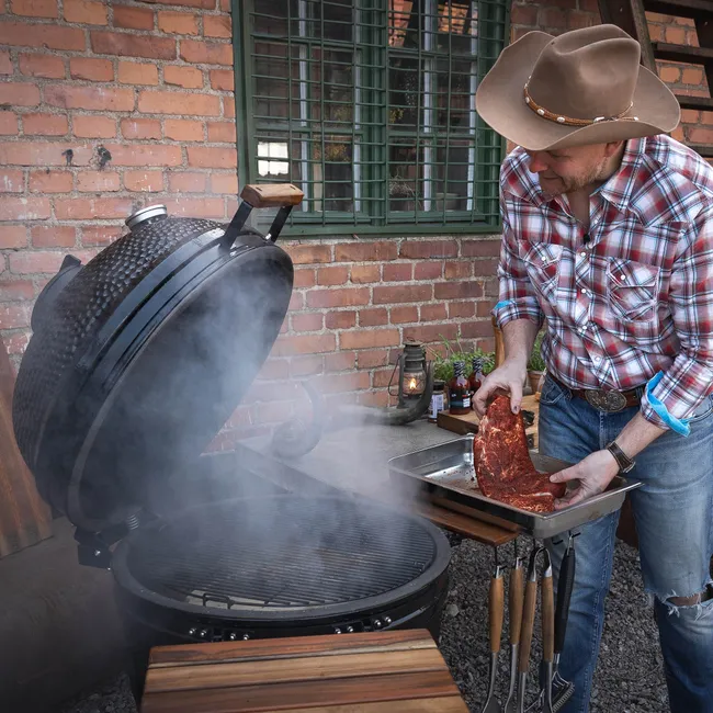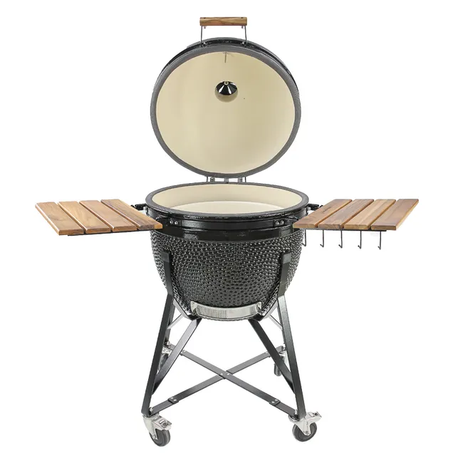 KAMADO SUMO MAXI Nuestro modelo más grande – perfecto para el verdadero maestro de la barbacoa que no se conformará con nada menos que lo mejor. Diseñado para hacer frente a todo, desde la habitual barbacoa familiar hasta grandes fiestas de 10 o más personas. ESPECIFICACIÓN SUMO MAXI 25: · Mesa auxiliar y asas de teca · Soporte para patas que incluye ruedas de servicio pesado en acero inoxidable · Rejilla de parrilla flexible de varios niveles · 2 deflectores de calor en forma de media luna · 5 piezas de ganchos integrados para herramientas de barbacoa · Termómetro situado en la parte superior de la tapa · Salida de aire superior de hierro fundido · Válvula inferior de acero inoxidable con pantalla protectora contra chispas · Caja recta MEDIR · Peso: 108 kg · Altura: 123 cm · Ancho: 137 cm con mesa auxiliar, 64 cm sin mesa auxiliar · Superficie de la parrilla: 56 cm