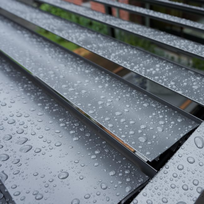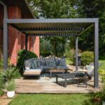 Pérgola de aluminio Naterial Clima Bio. Vive en total armonía con tu entorno bajo la pérgola bioclimática rectangular Naterial Clima. Aprovecha la luz natural y la calidez de tu clima mientras te proteges de la lluvia y el viento con esta pérgola adaptable. Orienta sus dos bloques de aspas para dar sombra a tu patio e interior, reduciendo el calor durante tus comidas al aire libre. Sus lamas de aluminio, una vez inclinadas, crean una ligera corriente de aire refrescante bajo la pérgola, dejando escapar el aire caliente. En caso de lluvia, cierre completamente el techo de la pérgola y mantenga el espíritu sereno; la pérgola está equipada con un sistema de drenaje con un flujo de agua hacia los pies de la estructura. Incline las aspas verticalmente cuando desee algo de luz y calor en su patio o terraza. Cómodo y fácil de combinar. El diseño contemporáneo de la pérgola bioclimática Clima aporta estilo a su exterior al tiempo que le permite combinarla con la mayoría de los salones de jardín, ya sea en términos de materiales y formas (madera, materiales sintéticos, metales), como en términos de usos (salón de jardín, comedor, cocina exterior). Con sus persianas vendidas por separado, vista su pérgola con protección adicional contra los rayos abrasadores o frente a los ojos. Esta versión en color gris oscuro realzará tu decoración exterior y te permitirá proteger una mesa de 6 a 8 comensales. Instalación y mantenimiento sencillos. Fabricada en aluminio de alta resistencia, la pérgola Bioclimática se fija al suelo con sus cuatro pies sobre la superficie plana que elijas en tu jardín, para resistir el temporal y tener siempre un espacio protegido de la intemperie. Una vez instalada, su pérgola Clima bioclimática se limpia fácilmente con agua jabonosa que resaltará su brillo. Siéntete libre de usar tu manguera de jardín para llegar a las áreas más altas. Disponible en otros colores y tamaños. Medidas: 3,13 x 2,29 x 3,58 m (ancho x alto x largo). Superficie de 11,2 m².